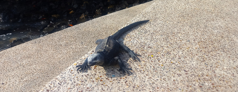 La tarde del 4 de abril pasamos por la Plaza Pelican Bay, mientras que en la mañana del 6 de abril estuvimos allí por la mañana. En la primera visita apreciamos el atardecer y en la segunda nos dirigimos hacia el muelle de los pescadores que se ubica junto a la plaza. Ahí fuimos testigos de la convivencia armónica entre los residentes de Galápagos y su fauna. Ninguna de las especies del sitio sienten temor por los humanos, ni estos son capaces de causarles algún daño. Pelícanos, iguanas y lobos marinos acompañan a los pescadores en su faena diaria y luego vuelven a su hábitat, el mar.